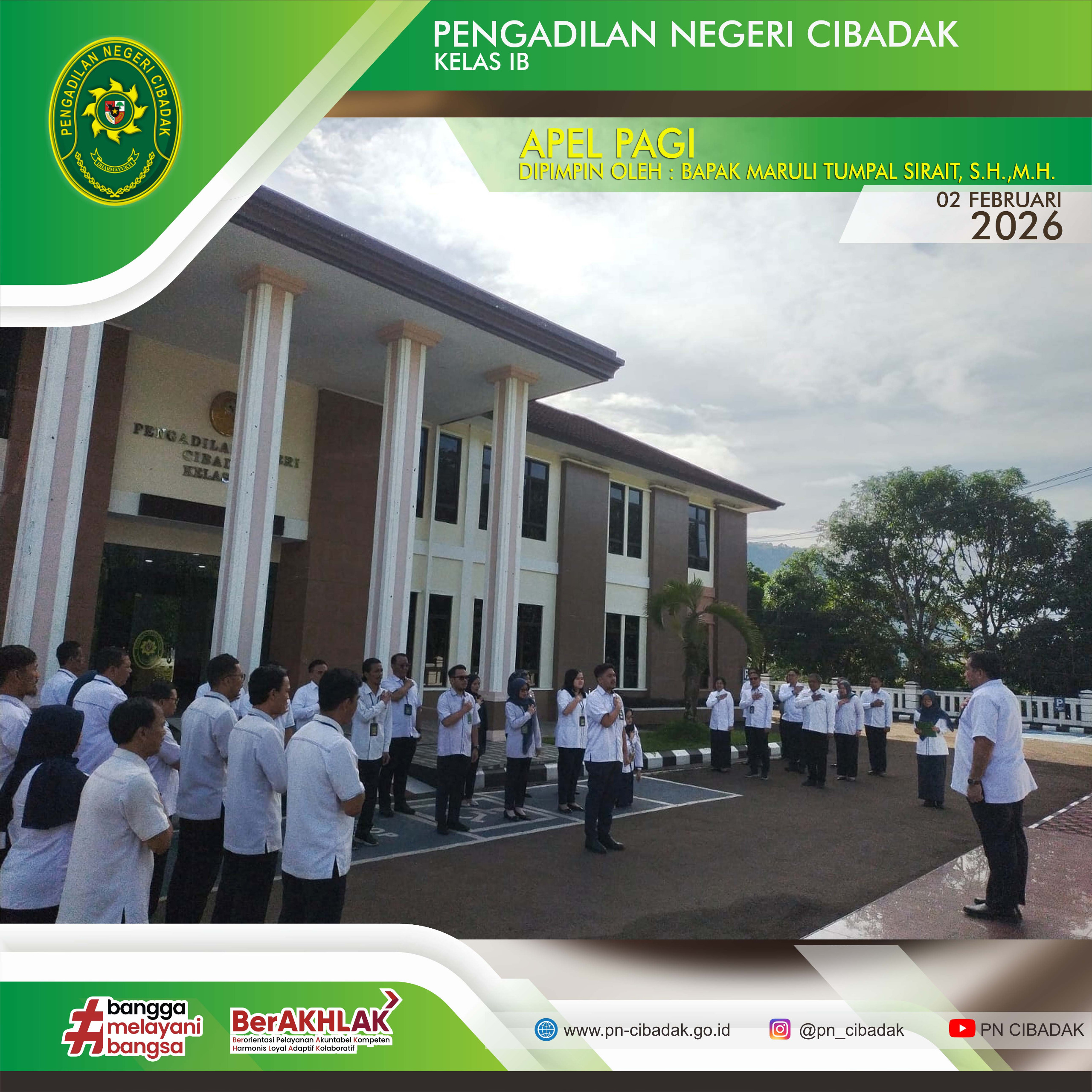 Pengadilan Negeri Cibadak melaksanakan Apel Pagi pada Senin, 02 Februari 2026, yang dipimpin oleh Wakil Ketua Pengadilan Negeri Cibadak, Bapak Maruli Tumpal Sirait, S.H., M.H.