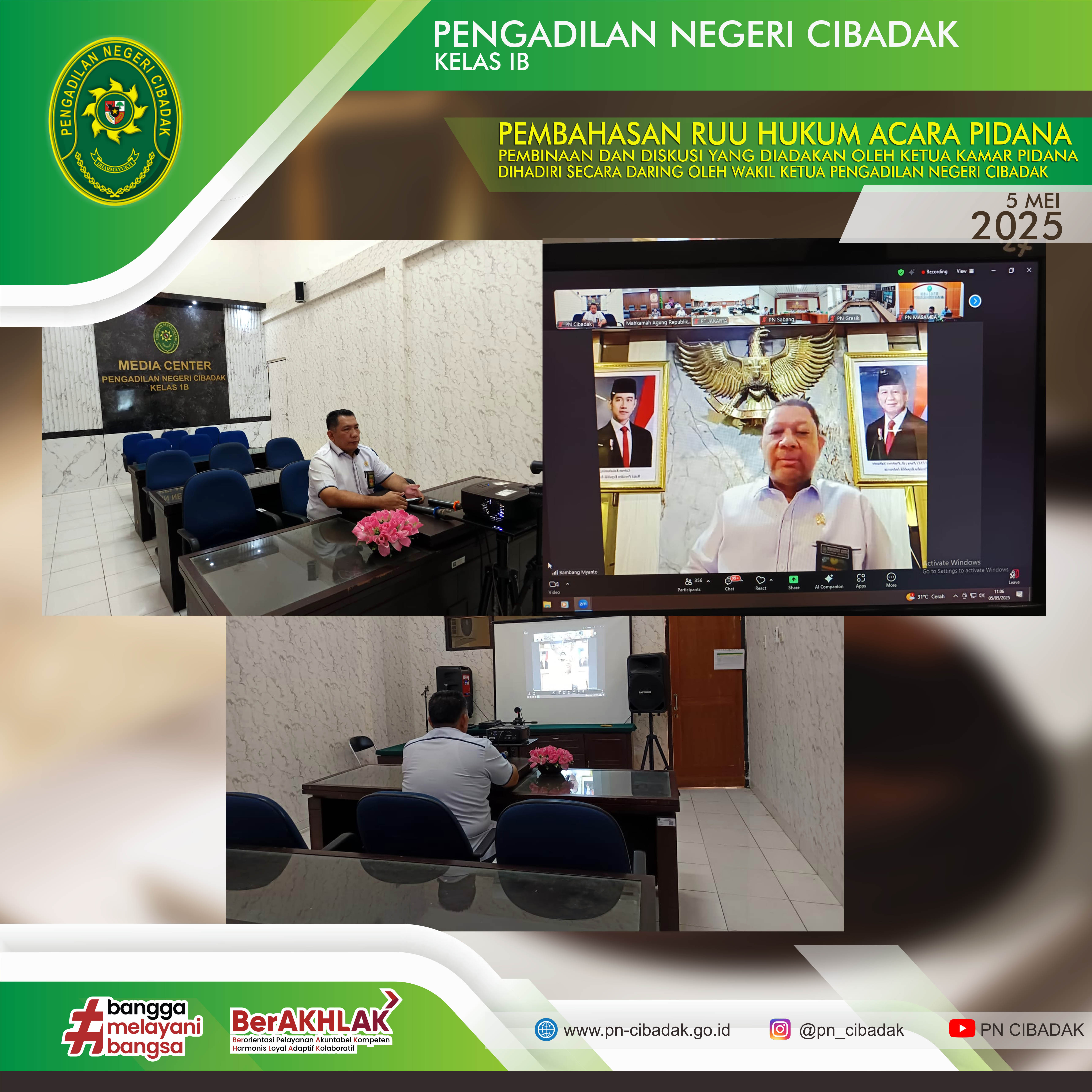Senin, 5 Mei 2025. Bertempatkan di Ruang Media Center Pengadilan Negeri Cibadak, Telah dilaksanakan Kegiatan Pembahasan RUU Hukum Acara Pidana oleh Ketua Kamar Pidana Mahkamah Agung RI Secara Daring. Kegiatan ini dihadiri oleh Wakil Ketua Pengadilan Negeri Cibadak, Bapak Maruli Tumpal Sirait, S.H.,M.H.