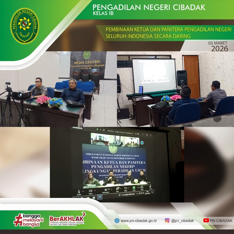 Ketua dan Panitera Pengadilan Negeri Cibadak mengikuti kegiatan Pembinaan Ketua dan Panitera Pengadilan Negeri Seluruh Indonesia yang diselenggarakan secara daring oleh Direktorat Jenderal Badan Peradilan Umum pada Selasa, 3 Maret 2025. Kegiatan ini diikuti dari Ruang Media Center Pengadilan Negeri Cibadak.