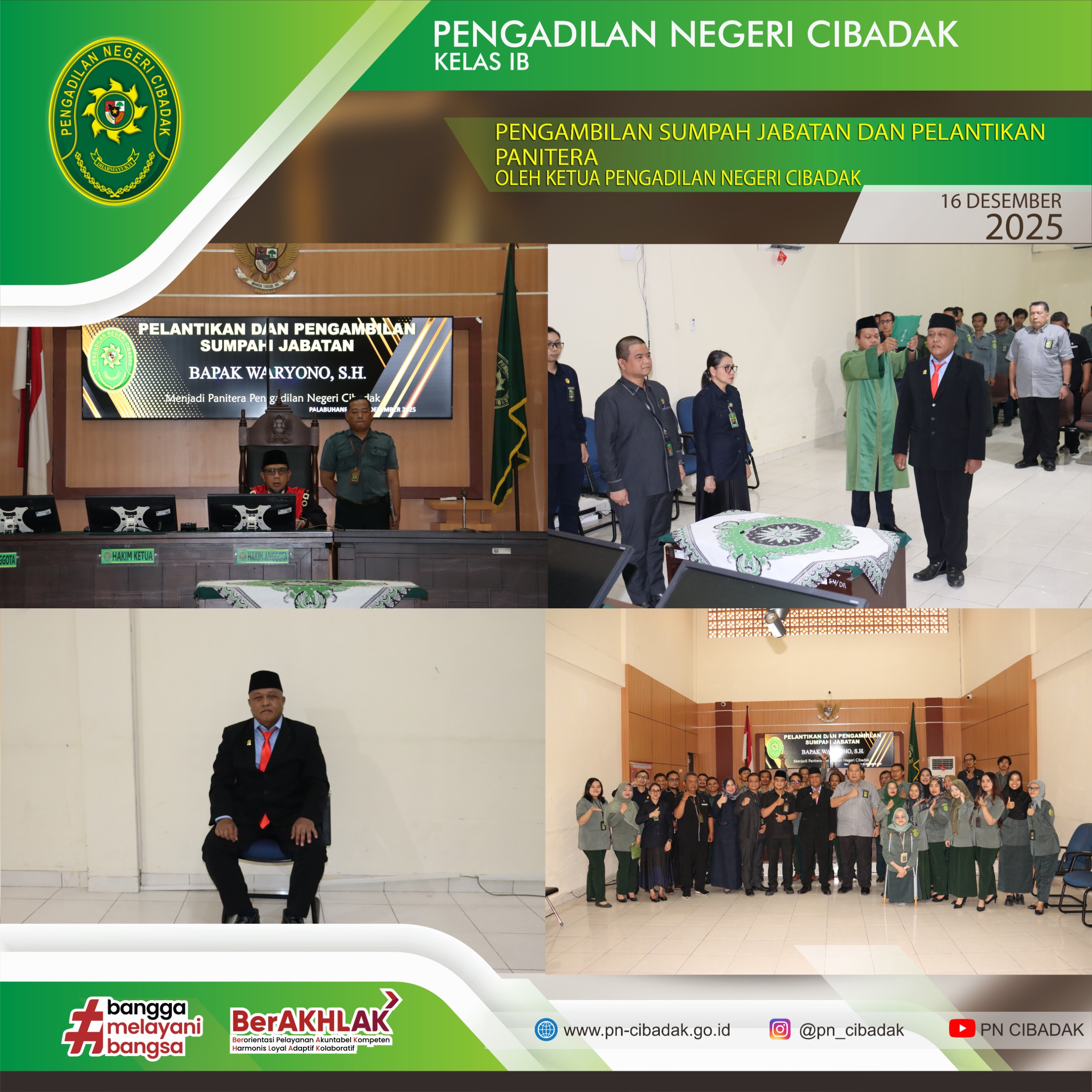 Pengadilan Negeri Cibadak melaksanakan kegiatan Pengambilan Sumpah Jabatan dan Pelantikan Panitera pada hari ini, bertempat di Ruang Sidang Utama Pengadilan Negeri Cibadak. Prosesi dipimpin langsung oleh Ketua Pengadilan Negeri Cibadak, Dede Halim, S.H., M.H.