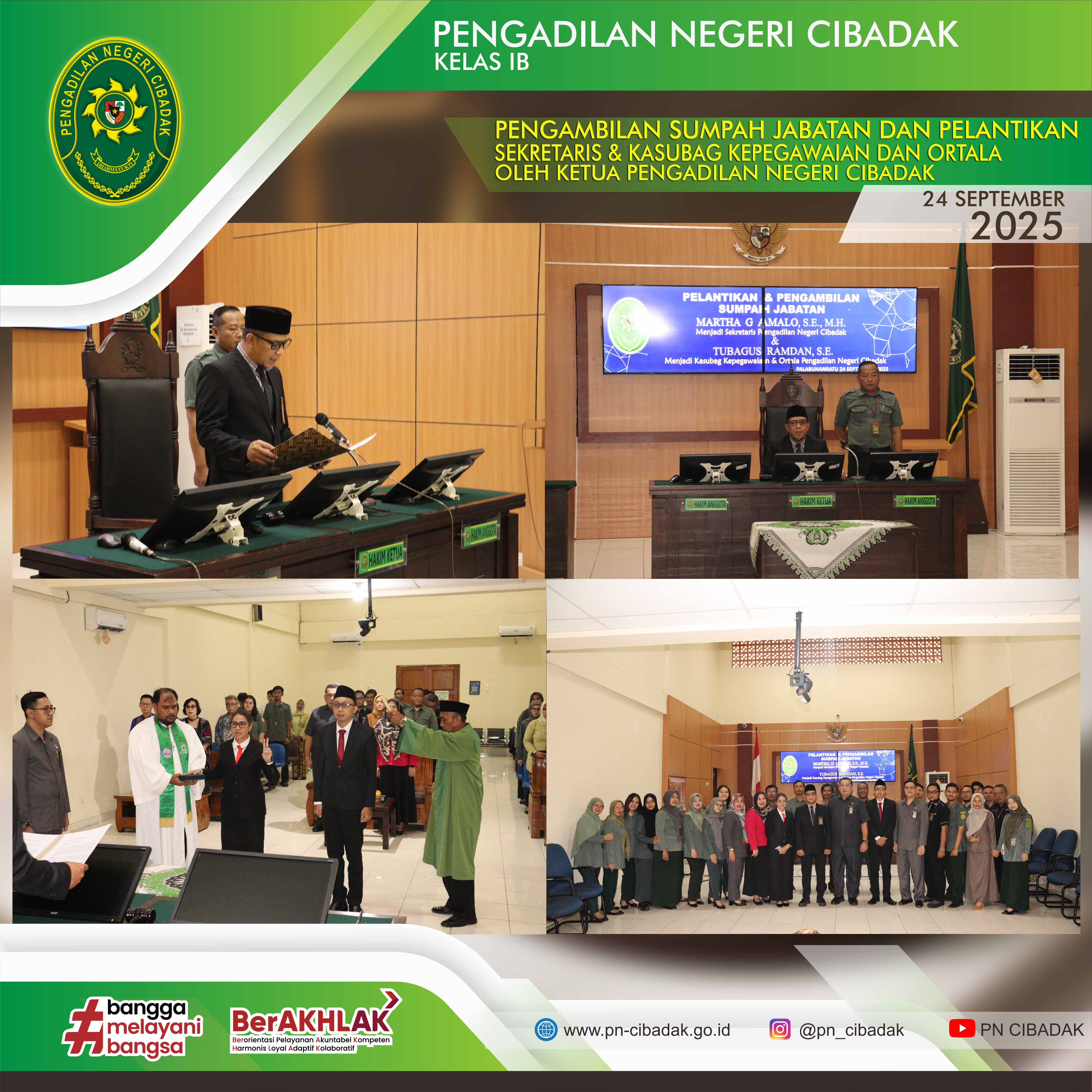 Palabuhanratu, 24 September 2025 – Telah dilaksanakan Pengambilan Sumpah Jabatan dan Pelantikan Sekretaris dan Kasubag Kepegawaian dan Ortala Pada Pengadilan Negeri Cibadak, Kegiatan ini dipimpin Oleh Ketua Pengadilan Negeri Cibadak, Bapak Dede Halim, S.H.,M.H. dan Dihadiri oleh seluruh Keluarga Besar Pengadilan Negeri Cibadak, adapun Pejabat pengambil sumpah diantarnya :