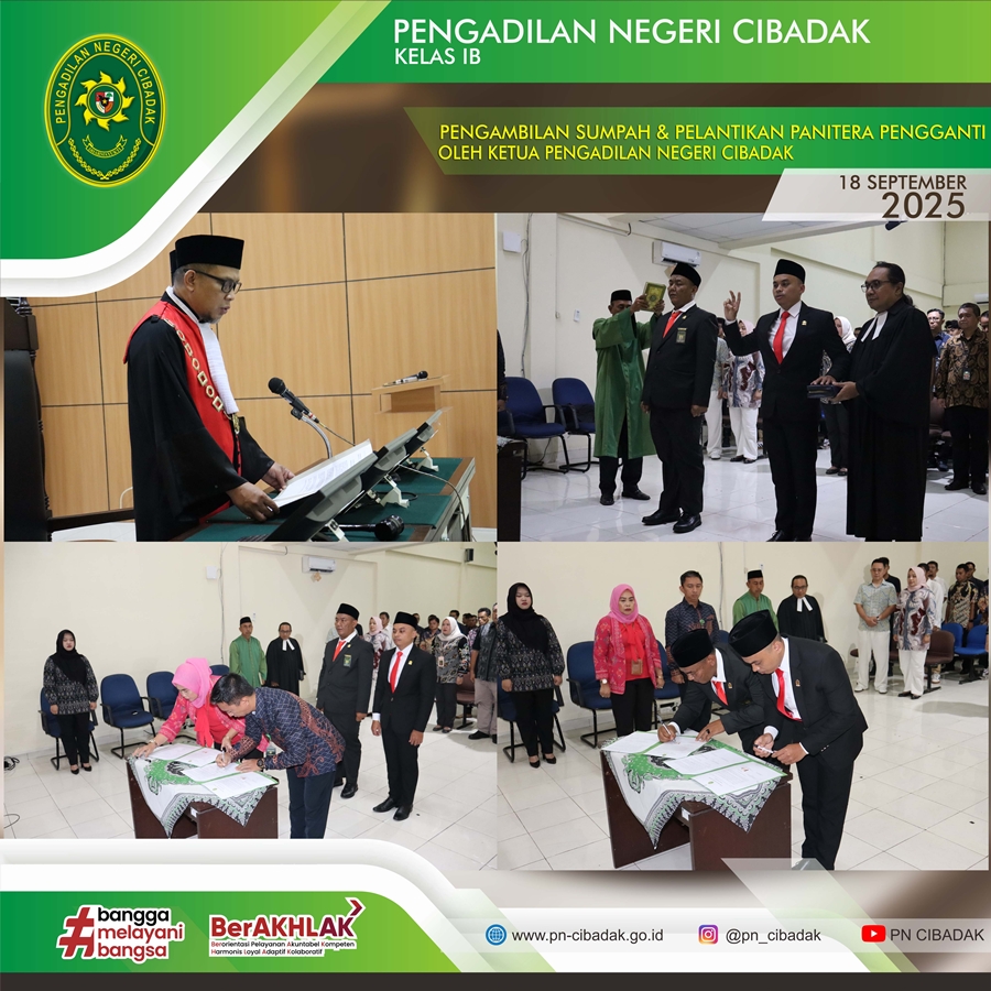 Palabuhanratu, 18 September 2025 – Telah dilaksanakan Pengambilan Sumpah Jabatan dan Pelantikan Panitera Pengganti Pada Pengadilan Negeri Cibadak, Kegiatan ini dipimpin Oleh Ketua Pengadilan Negeri Cibadak, Bapak DEDE HALIM, S.H.,M.H. dan Dihadiri oleh seluruh Keluarga Besar Pengadilan Negeri Cibadak, adapun pengucap sumpah jabatan diantarnya :