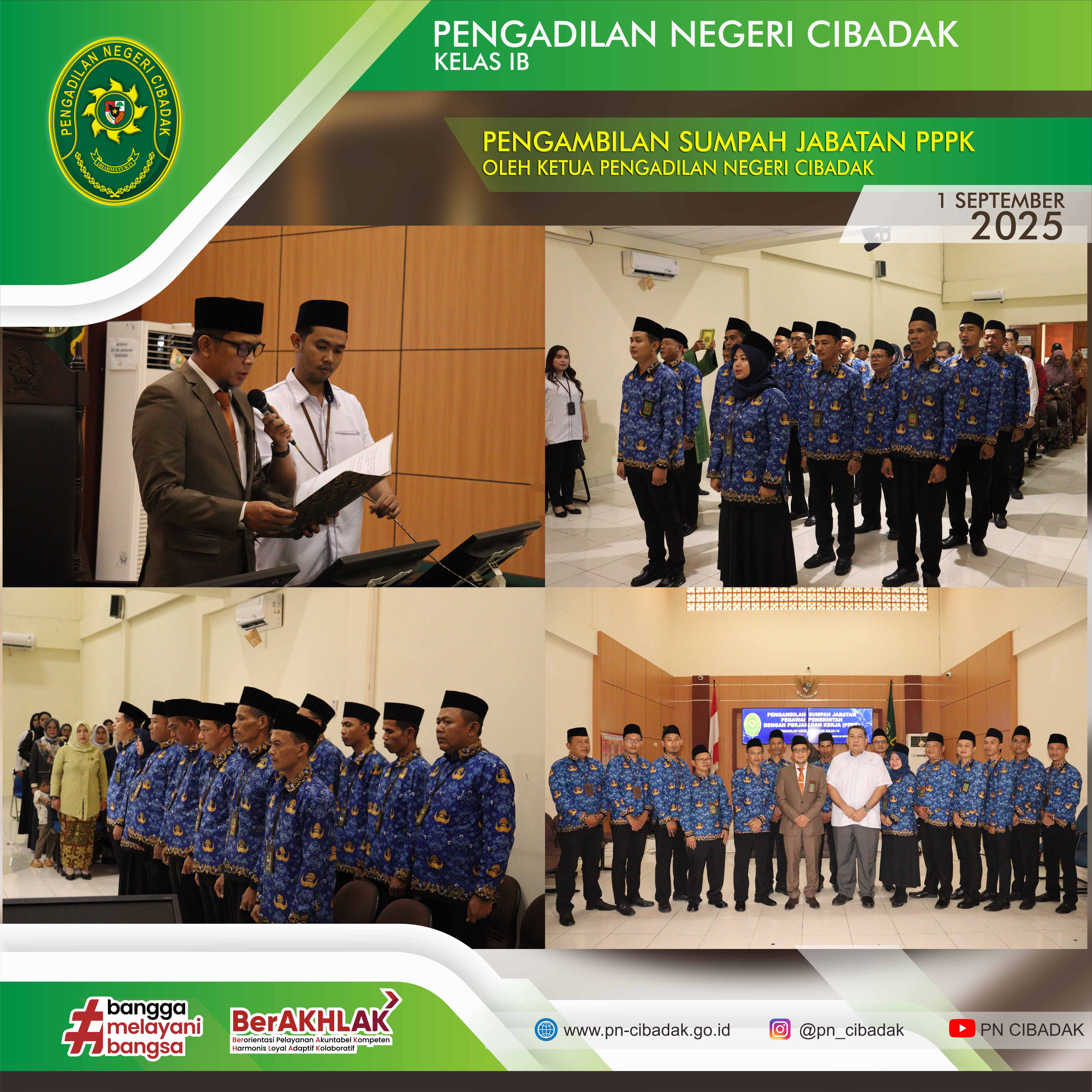 Palabuhanratu, 1 September 2025 – Telah dilaksanakan Pengambilan Sumpah Jabatan bagi Pegawai Pemerintah dengan Perjanjian Kerja (PPPK) pada Pengadilan Negeri Cibadak Kelas 1B, 15 orang pegawai yang disumpah oleh Ketua Pengadilan Negeri Cibadak, Bapak Dede Halim, S.H.,M.H. Kegiatan ini dihadiri oleh seluruh keluarga besar Pengadilan Negeri Cibadak dan Keluarga dari pegawai yang disumpah.