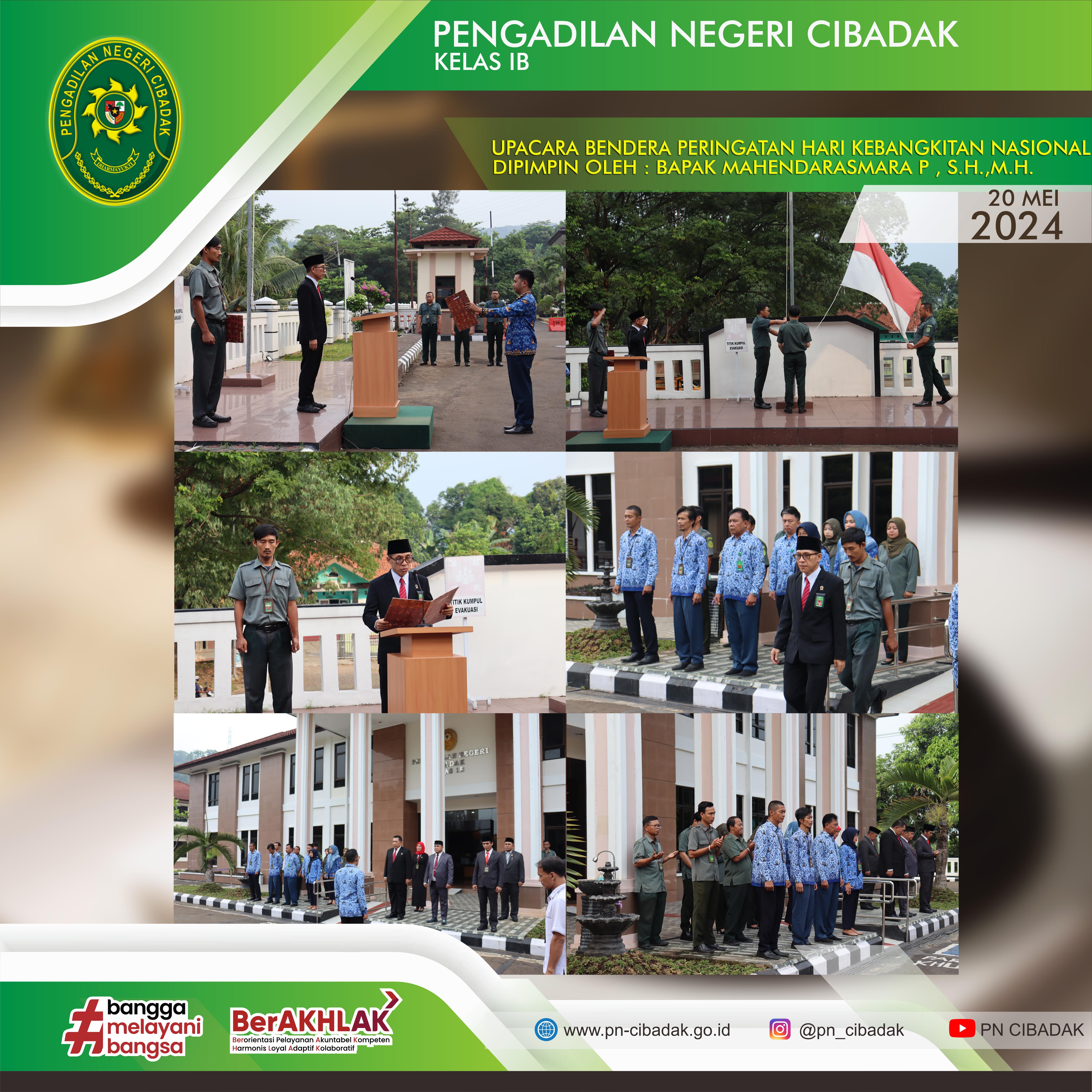 Senin, 20 Mei 2024. Bertempatkan di Halaman Depan Gedung Pengadilan Negeri Cibadak Kelas 1B, telah dilaksanakan kegiatan upacara bendera memperingati Hari Kebangkitan Nasional yang ke-166. Upacara bendera ini dipimpin oleh Ketua Pengadilan Negeri Cibadak, Bapak Mahendrasmara Purnamajati, S.H.,M.H. Dan dihadiri oleh seluruh Hakim, Pejabat dan Pegawai pada Pengadilan Negeri Cibadak.