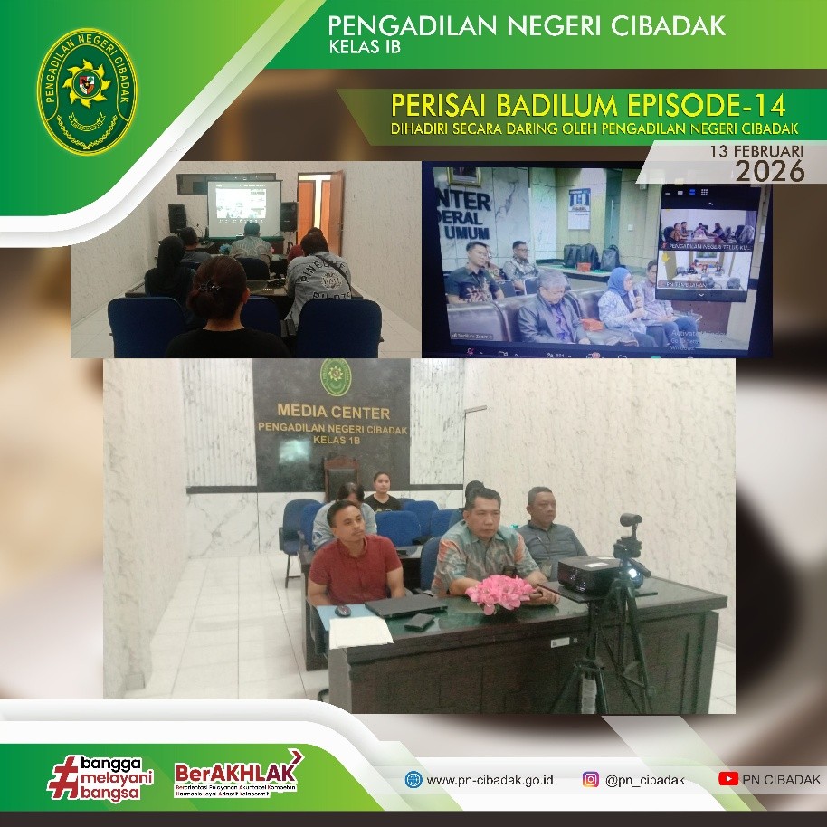 Pada Jumat, 13 Februari 2026, bertempat di Ruang Media Center Cibadak, Pengadilan Negeri Cibadak mengikuti kegiatan Perisai Episode 14 secara daring yang diselenggarakan oleh Direktorat Jenderal Badan Peradilan Umum (Badilum) dengan tema “Hukum Pembuktian dalam Perspektif KUHAP”.