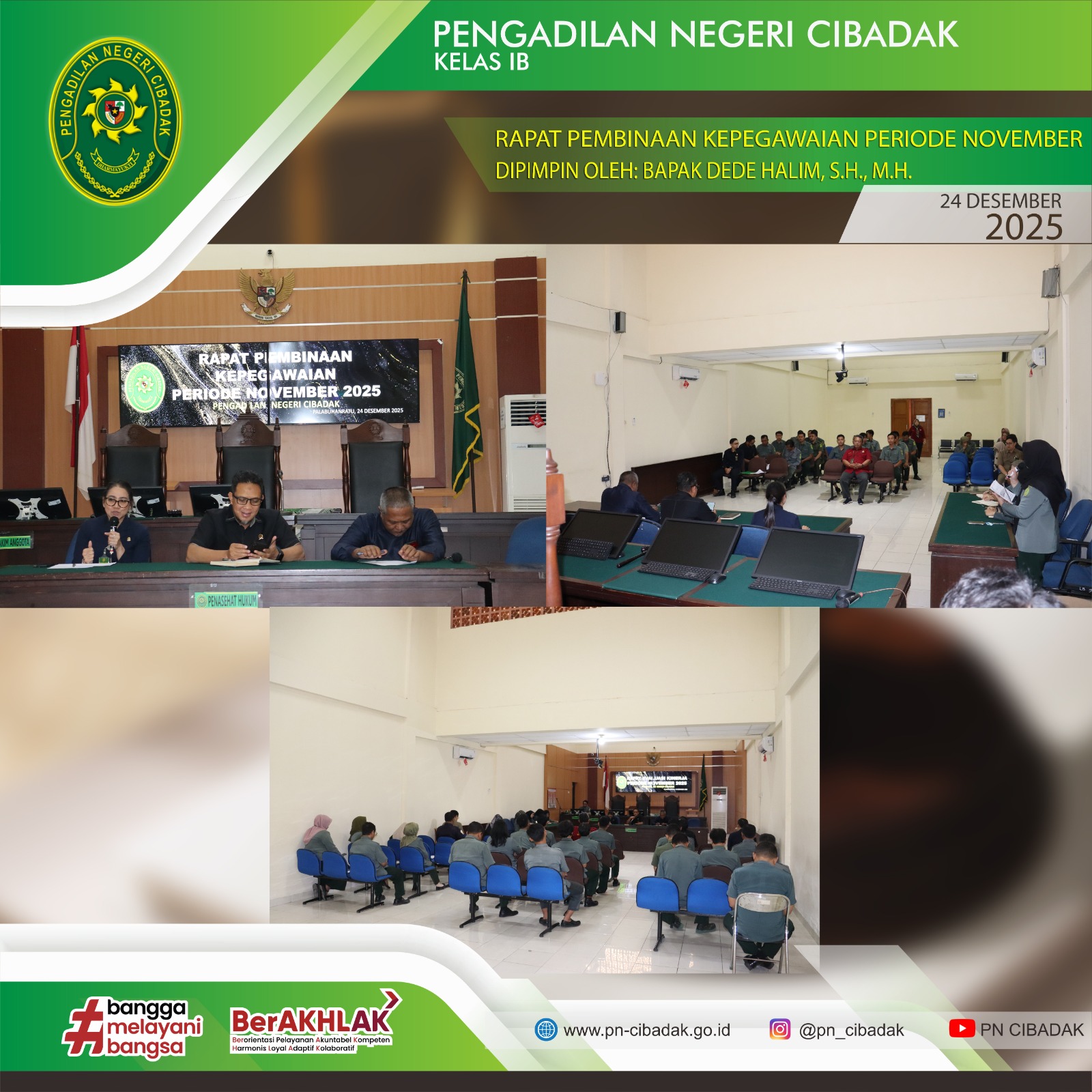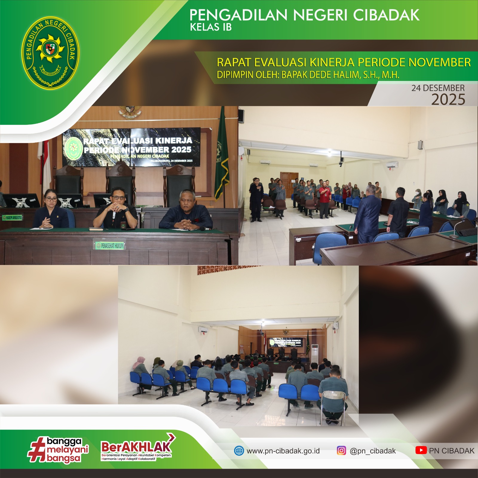 Pengadilan Negeri Cibadak menyelenggarakan Rapat Evaluasi Kinerja, Rapat Pembinaan Kepegawaian, serta Rapat Evaluasi Anggaran untuk periode November 2025 pada Rabu, 24 Desember 2025. Kegiatan tersebut dilaksanakan di Ruang Sidang Garuda Pengadilan Negeri Cibadak, Palabuhanratu.