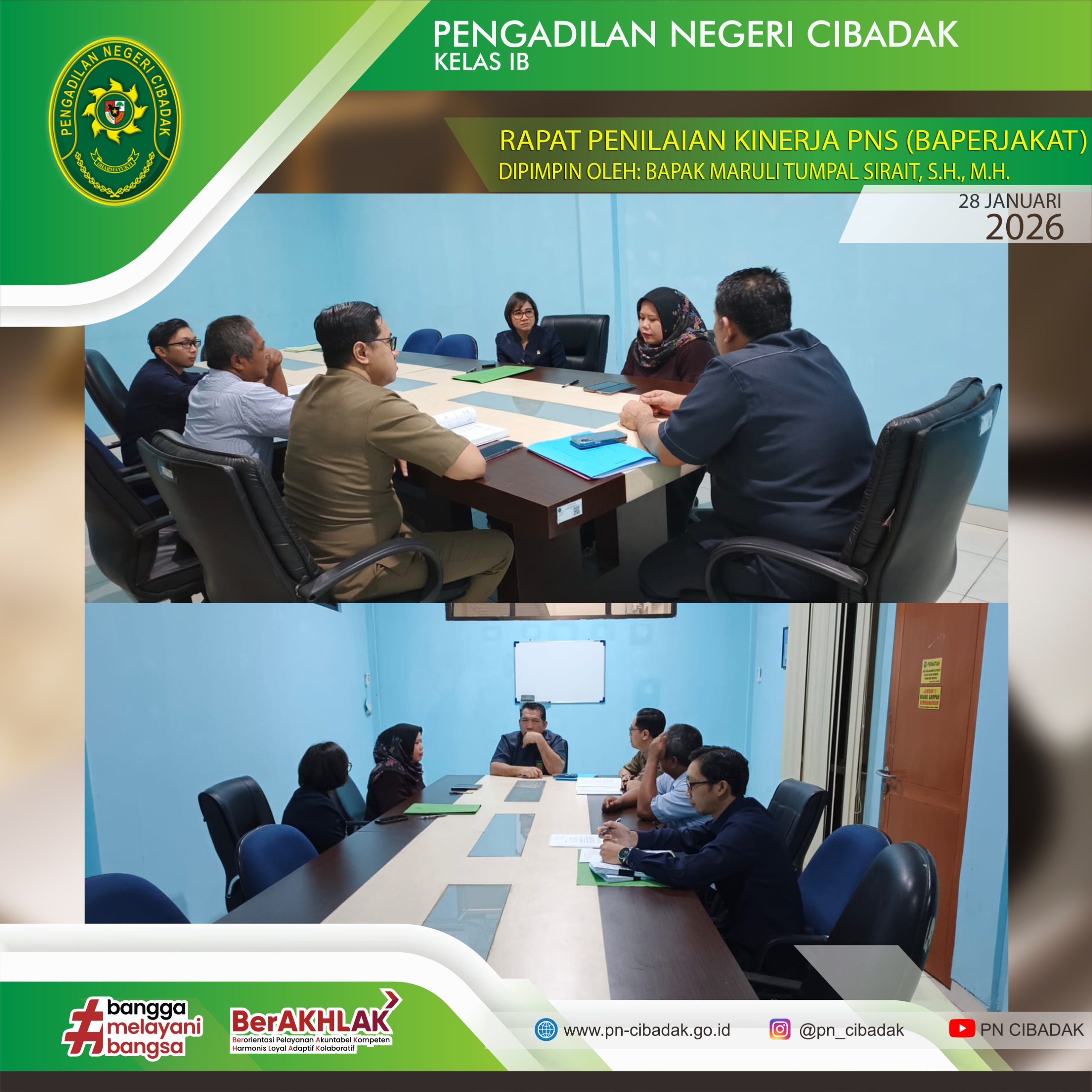 Pengadilan Negeri Cibadak mengadakan Rapat Penilaian Kinerja Pegawai Negeri Sipil (Baperjakat) bertempatkan di Ruang Mediasi Pengadilan Negeri Cibadak yang dipimpin oleh Bapak Maruli Tumpal Sirait, S.H., M.H.