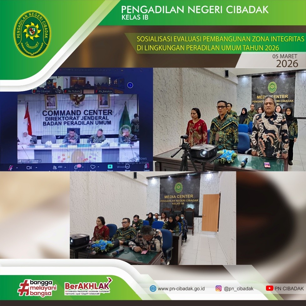 Kegiatan ini menghadirkan narasumber dari Dirjen Badilum, Badan Pengawasan Mahkamah Agung RI, serta Kementerian Pendayagunaan Aparatur Negara dan Reformasi Birokrasi (Kemenpan RB) yang menyampaikan materi terkait evaluasi pembangunan Zona Integritas, penguatan komitmen reformasi birokrasi, serta peningkatan kualitas pelayanan publik di lingkungan peradilan.kegiatan ini dihadiri oleh Ketua, Panitera, Sekretaris, serta para pegawai Pengadilan Negeri Cibadak. Melalui kegiatan ini diharapkan seluruh satuan kerja di lingkungan peradilan umum dapat semakin memahami proses evaluasi pembangunan Zona Integritas serta memperkuat komitmen dalam mewujudkan wilayah bebas dari korupsi dan birokrasi yang bersih serta melayani.