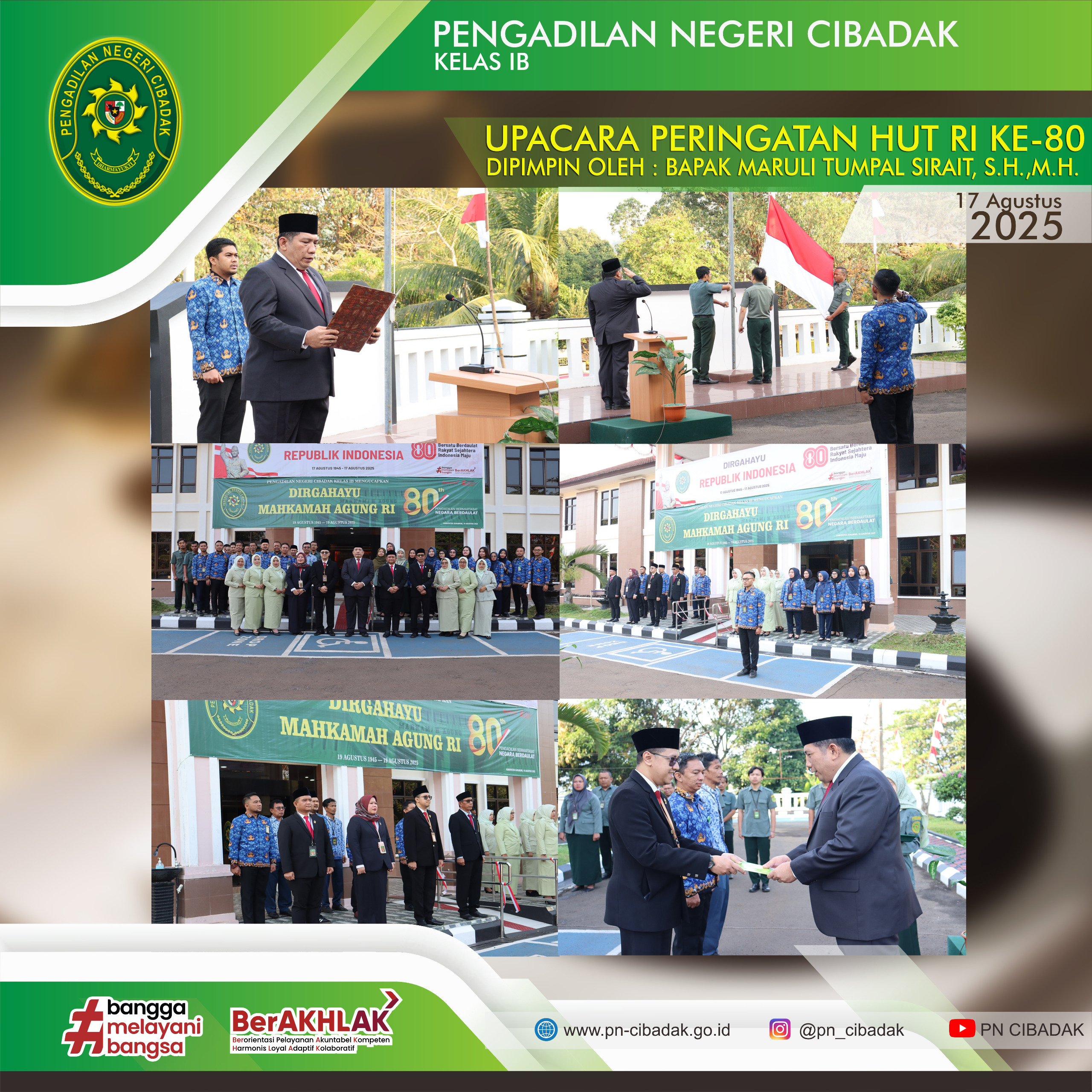 Palabuhanratu, 17 Agustus 2025 – Dalam rangka memperingati Hari Ulang Tahun Kemerdekaan Republik Indonesia yang ke-80 dengan tema “Bersatu Berdaulat, Rakyat Sejahtera, Indonesia Maju”, Pengadilan Negeri Cibadak menyelenggarakan upacara bendera pada hari Minggu, 17 Agustus 2025, bertempat di halaman depan Gedung Pengadilan Negeri Cibadak.