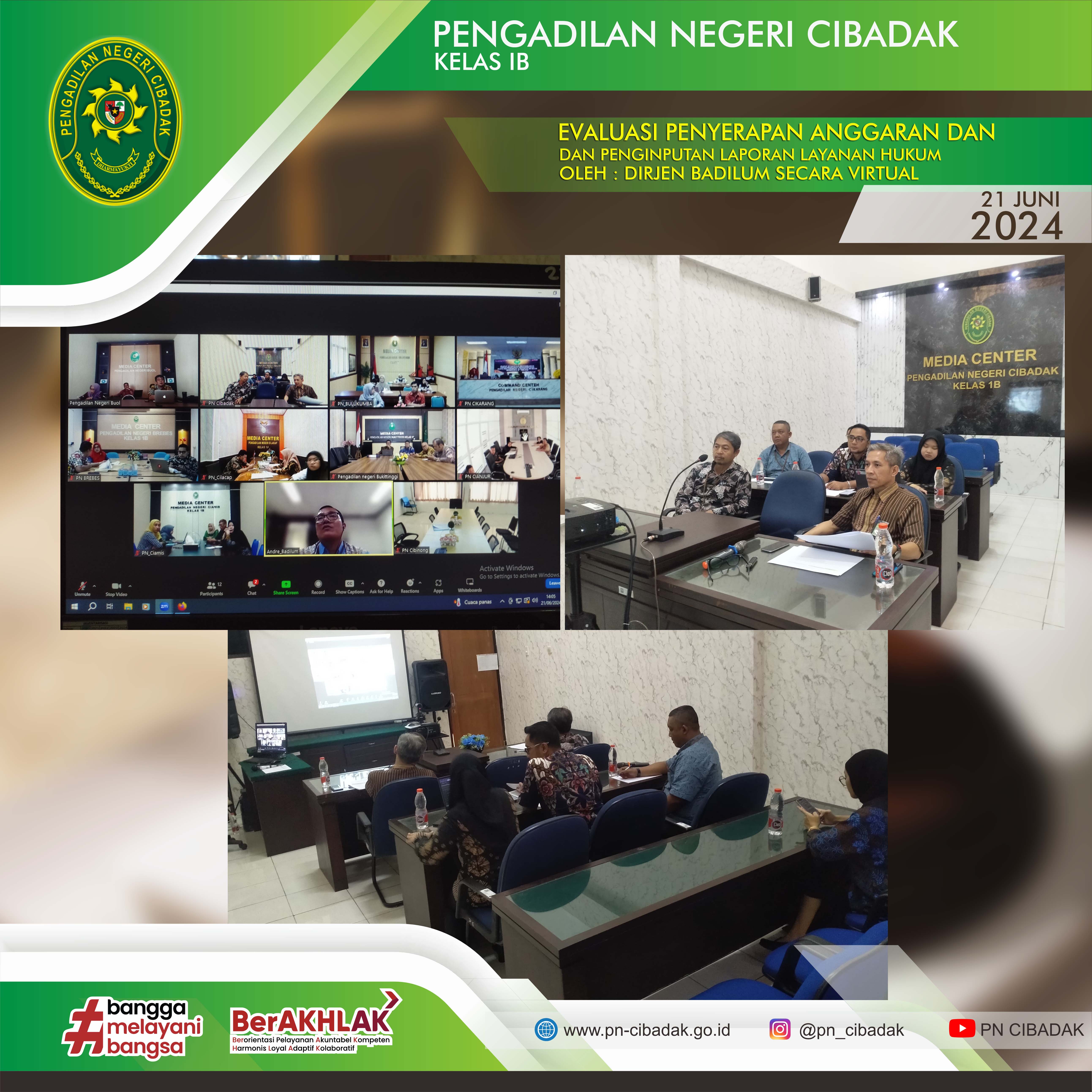 Pada Hari Jumat, 21 Juni Tahun 2024. Bertempatkan diruang Media Center Pengadilan Negeri Cibadak Kelas 1B Telah dihadiri kegiatan Evaluasi Penyerapan Anggaran Prodeo dan Penginputan Laporan Layanan Hukum Tahun 2024 semseter 1 oleh Dirjen Badan Peradilan Umum. Kegiatan ini dihadiri oleh Pimpinan, Pejabat, dan Pegawai yang terkait dengan anggran dan pelaporan.